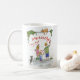 A caneca branca com crianças escrevendo mensagens de apreço pelo seu Pai numa parede. Dois gatos olhando.
