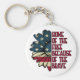 Um chaveiro patriótico - uma margarida com a bandeira dos EUA sobreposta... e a declaração "O lar dos livres por causa dos corajosos"