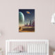 Uma cidade desolada com 2 luas estranhas no céu e um estranho planeta em forma no céu. Esta é uma arte gerada por IA.