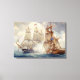 Uma pintura representando a Constituição dos EUA disparando sobre o Java e derrubando o mastro. A Constituição foi comandada pelo Capitão William Bainbridge. Feito em marinho azul, cinza e castanho. Linda arte de vintagem para sua casa ou escritório