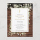 Com luzes bonito de cordas e delicadas folhas de cor d'água verde sobre um fundo de painéis de madeira rústicos e um elegante crucifixo de ouro, este batismo ou convite batizante pode ser personalizado com suas informações especiais. Projetado por Thisnotme©