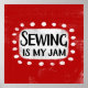 "Sewing Is My Jam" é um design de texto divertido com uma forma de sotaque branca cercado por pontos brancos texturizados.