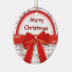 A fita vermelha do Feliz Natal nota o ornamento. O texto pode ser personalizado e a foto pode ser adicionada para dentro.