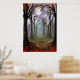 Floresta assustadora com árvores assustadoras e chão vermelho e verde, a lua brilha no céu. Esta é uma arte gerada por IA