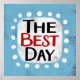 "O Melhor Dia" é um design de texto bonito, azul-claro, com texto preto e vermelho, junto com uma forma de sotaque branca e pontos brancos texturizados ao seu redor.