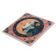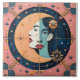 Azulejo arte do rosto de uma mulher representando o dia e a noite da lua, dentro um disco circular de estrelas e planetas, em meio a um fundo rosa-coral.