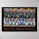 Membros da USMC Silent Drill Team fazendo movimentos de precisão com espingardas durante uma performance em San Diego, Califórnia. As palavras "A prática torna-se perfeita"