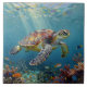 A sea turtle themed tile with an illustration of a sea turtle under a calm teal sea swimming among the coral on the ocean floor with sun rays beaming down on him through the aqua water. Add a coastal feeling to your beach home by adding this to your backsplash!