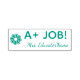 Este design de carimbo motivador apresenta a mensagem de elogio "A+ JOB!" e o nome de um professor ou educador personalizado. Também apresenta um ícone decorativo de forma de flor. Ele poderia ser usado por um professor, educador, ou tutor ao marcar tarefas, para reconhecer que um aluno fez bem.