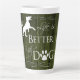 Uma caneca perfeita para aqueles que amam lattes e encontram a vida muito melhor quando há um cachorro nela. A Vida é melhor com um design de Caneta Latte de Cão que mostra um texto que diz "A vida é melhor com um Cachorro." com uma impressão de pata e um embelezamento de silhueta de cão contra um fundo verde-rústico profundo de madeira. Itens de presentes adicionais disponíveis com este design também.
