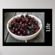 Fotografia de cerejas sobre fundo preto com a palavra "Vida" impressa no lado direito.