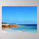 Foto: água do mar azul aqua com ondas suaves batendo a areia, rochas rugosas beijando a borda e um céu glorioso azul