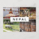 Cartão postal com uma colagem de quatro fotos da vida e paisagens do Nepal, como o templo e as rodinhas em Katmandu, ravando grãos em Bhaktapur e o safari do elefante em Chitwan NP.