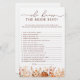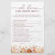 Este item é uma mistura cativante de calor interno e elegância boêmica que promete tornar sua celebração inesquecível. A peça central desta peça é uma abóbora lindamente trabalhada, delicadamente pintada em tons suaves, simbolizando a abundância e a alegria da estação do outono. Ao redor da abóbora, você encontrará um espantoso conjunto de flores aquarelas e folhagem em tons ricos de terracota, laranja, evocando as vibrantes cores do outono. Esse item captura lindamente o espírito de um chá de panela de queda, misturando encanto rústico com elegância boêmica para criar um design que é eterno e encantador. Com sua incrível combinação de arte aquática e elementos boho-quicos, este item promete uma celebração tão única e especial quanto a própria noiva. Clique no botão "Personalizar" para personalização adicional deste modelo. Você poderá modificar o estilo, as cores e os tamanhos. Itens correspondentes disponíveis.