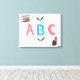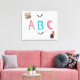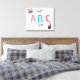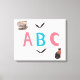 Esta canvas retrata o ABC de um leitor antigo junto com fotos de um antílope, pássaros e um gato.