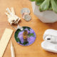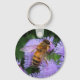 Esta chaveiro apresenta uma abelha de mel em flores roxas de estrato em um círculo de verde em um dia quente de verão.