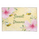 Bons sonhos! Fundo amarelo, branco com um padrão de mel. Decorado com flores tropicais cor-de-rosa, hibisco e abelhinhas felizes. Com o texto: Sonhos Doce. Texto com letra verde. Perfeito para sua casa de verão! Volta: padrão de colmeia ouro.
