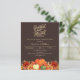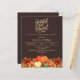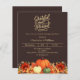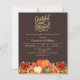 Um fundo castanho escuro. Decorado com abóboras e flores laranja e amarelas. Personalize e adicione os detalhes da festa. Script de texto: Grateful e abençoado. 1 folha = 1 convite impresso de borda a borda.