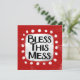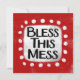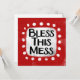 "Bless This Mess" é um design de texto fofo em vermelho com texto preto, junto com uma forma de sotaque branca e pontos brancos texturizados ao seu redor.