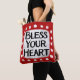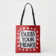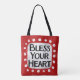 "Abençoe seu coração" é um design de texto bonito em vermelho com texto preto, junto com uma forma branca de sotaque e pontos brancos texturizados ao seu redor.