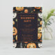 Decoração de festa infantil de Halloween, laranja e preto, com abóboras e monstros fofos com chapéus mágicos.