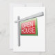 Esta design é de uma placa de casa aberta. Do tipo que teria se vendesse sua casa. O sinal de casa aberta é vermelho com escrevendo branco e é anexado a um posto. Este design de placa de open house parece excelente nestes convites