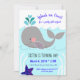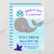 Festa de aniversário temática de baleia do mar náutico. Ajuste o texto para torná-lo seu. Mão desenhada, ilustração adorável de baleias. Tema azul claro e branco, fundo listrado constituem esse design de aniversário fofo. Primeiro Aniversário. Festa de garotos. Tema azul claro.