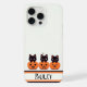 Três adoráveis gatinhos pretos a espreitar de jack-o-lanternas, cada um com uma expressão brincalhona. Uma cena fofa do Halloween com abóboras e morcegos minúsculos, perfeita para uma vibração festiva.