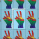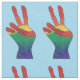 A pintura abstrato de uma mão nas cores do arco-íris, que dá um sinal de paz, está ligada ao tecido personalizado. A cor de fundo do azul-céu pode ser personalizada.