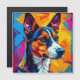 Ilustração brilhante e animada de abstrato de um cão Basenji usando cores ousadas e linhas agudas. Perfeito para entusiastas da arte e inspirado em retratos criativos e vibrantes para animais de estimação.