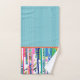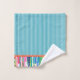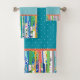 Banhe o seu banho em drama com este conjunto de toalhas. Minha amiga Marilyn é uma colorista que brinca com papel, tinta e design. Eu emparelhei seus elementos de colagem de luz do seu impressão de Caribe 'Calypso' com um dramático campo de bolinhas azul-aqua, listras aqua e listras de chevron laranja.