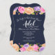 Um convite floral deslumbrante com fundo azul-marinho e uma abundância de flores rosa, lavanda e amarelas bordejando as bordas superior e inferior do cartão. (Design por Freepik). <br/><br/>O cartão é fácil de personalizar com sua redação, fonte, cor da fonte e escolha de seis tipos de papel.<br/><br/>Não é exatamente o que você está procurando? Todos os nossos produtos podem ser personalizados para atender às suas necessidades sem custo adicional.<br/><br/>Basta entrar em contato conosco em askcottonlamb@gmail.com<br/><br/>Produtos coordenados disponíveis: