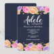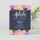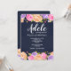 Um convite floral deslumbrante com fundo azul-marinho e uma abundância de flores rosa, lavanda e amarelas bordejando as bordas superior e inferior do cartão. (Design por Freepik). <br/><br/>O cartão é fácil de personalizar com sua redação, fonte, cor da fonte e escolha de seis tipos de papel.<br/><br/>Não é exatamente o que você está procurando? Todos os nossos produtos podem ser personalizados para atender às suas necessidades sem custo adicional.<br/><br/>Basta entrar em contato conosco em askcottonlamb@gmail.com<br/><br/>Produtos coordenados disponíveis: