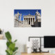 Poster da Academia de Artes de Atenas, Grécia, com as estátuas dos antigos filósofos gregos Platão (à esquerda) e Sócrates (à direita). A estátua da deusa grega mitológica Athena está atrás de Platão.