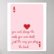 Transforme a motivação diária em decor chic com esta arte motivacional de parede do Ace of Hearts. Projetada em uma estética cor-de-rosa suave com um layout minimalista de cartas de jogar, esta peça apresenta a emocionante citação de pôquer: "você não pode mudar as cartas que você foi tratado, exatamente como você toca a mão." A elegante tipografia de guiões, cantos arredondados e ícones cardíacos ricos criam um visual moderno, mas eterno, de cartas que se combina lindamente com salas dormitórias, quartos, escritórios e salas de jogos. Quer você ame noites de pôquer ou simplesmente aprecie metáforas inteligentes, este design defende a mentalidade do crescimento sobre a sorte. É um presente de encorajamento pensativo para um amigo iniciar um novo capítulo, um presente de graduação, ou uma doce surpresa do Dia do Namorados para alguém que ama o minimalismo romântico. Emparelhe-o com outra arte motivacional de parede para uma parede de galeria, ou deixe-o ficar sozinho como um lembrete diário para tocar sua mão com confiança. Zazzle vende à procura de arte de parede imprimível, decoração de sala cor-de-rosa, ou um presente para ela vai amar a forma como esta peça adiciona personalidade sem desordem. Escolha seu tamanho e formato de produto preferidos para se adequar ao seu espaço — poster, canvas ou cartão — e crie uma vibração confortável e autoexpressiva que se sente na moda e intencional. Trate a si mesmo uma dose de coragem e charme: adicione este Ace of Hearts art ao seu carrinho hoje e dê ao seu espaço a energia elevatória que ele merece. Perfeito para tratar a si mesmo ou alguém especial! ( Para aqueles que compram a versão de Download Instantâneo, por favor, envie-me uma mensagem se você deseja tamanhos adicionais para melhor atender às suas necessidades.)