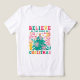 Acredite na Mágica da Camisa Tripla Festiva de Natal do Retro Boho Boho apresenta o texto "Acredite na Mágica do Natal" na tipografia moderna, acentuada com a colorida árvore de Natal Matisse, flores e uma vela. Perfeito para presentes de Natal, festas de Natal e festas de Natal, aniversários e muito mais. Criado pelo Evco Studio www.zazzle.com/store/evcostudio