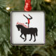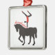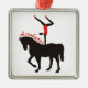 Acrobática no ornamento personalizado de cavalo com uma mulher em vermelho fazendo acrobacia em uma silhueta de cavalo preto.
