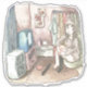 ADESIVO さやしくじ 衣類のかけてある部屋の座椅子に座ってテレビを見ながら靴下をはいている女性のイラスト