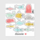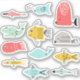 Peixes: recolha de 12 peixes diferentes em tons de vermelho, azul, verde, amarelo e cinza.
