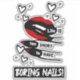 A vida é muito curta para ter Unhas chatas, esta design apresenta lábios vermelhas e longas unhas pretas e texto dizendo "A vida é muito chata para ter Unhas chatas".