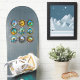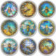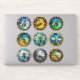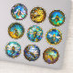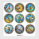 Este pacote de 9 adesivos apresenta abelhas e favos de mel em vidro manchado em tons de azul, verde e ouro.