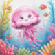 Uma pintura aquosa que retrata uma adorável água-viva rosa flutuando graciosamente num mar cintilante.