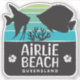 Um design de pôr do sol ousado, inspirado na vintagem, celebrando Airlie Beach, na região de Whitsunday de Queensland, Austrália. Esta design em forma de arco apresenta uma silhueta impressionante de um peixe tropical e coral com um fundo aqua em greve.