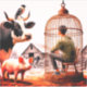 Este adesivo tem animais de fazenda olhando para um garoto em uma gaiola.