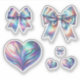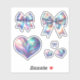 Esse elegante adesivo de vinil apresenta arcos e corações iridescentes em vários tamanhos com cores brilhantes do arco-íris e qualidades luminosas. O na moda, o arco e o autocolante do humor irão adicionar um toque de talento a qualquer coisa que você os adicionar também.