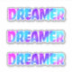 Você é um sonhador de coração, sempre vendo o mundo como ele poderia ser? Então, este colorido adesivo de arte é perfeito para você! A palavra "sonhador" está escrita em tons brilhantes de roxo, rosa e aqua.