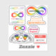 Um conjunto de autocolantes autistas para pessoas autistas e suas famílias. As designs são: "Aceitação autista" com infinidade no arco-íris, "neurodiversidade" escrita sobre uma fita arco-íris, "Autismo não é uma tragédia. Ignorância é", um símbolo infinito do arco-íris solteiro que representa o orgulho autista e a neurodiversidade, "Consciência do Autismo" com conscientização riscada e substituída por "Aceitação", "Mãos apavoradas são mãos felizes", e "Olá, eu sou AUTISTIC" num estilo de nome.