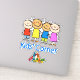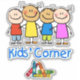 Vinheta-vinil com uma imagem de quatro crianças sorridentes, cinco lápis, e o termo "Canto de Crianças" em letras azuis divertidas. Veja a coleção inteira do Kids'Corner Sticker nos CONVITES | Seção Stickers & Labels