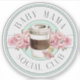 Apresentando o texto "Baby Mama Social Club" com gráficos aquosos de flores, uma xícara de café e um pacificador de bebê em fundo aqua. Este design dá um belo presente de chá de fraldas para uma mãe ser ou um saco de diversão e na moda para grupos de mães.
