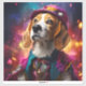 Um Beagle brincalhão vestido com uma fantasia vibrante e branca contra um pano de fundo brilhante e mágico. Essa design encantadora é perfeita para amantes de os animais.